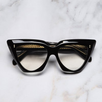 A maximalist take on the cat-eye – the 1407 optical is shaped with a high stepped browline that drops to a rounded base. The split-layer construction adds luminosity, tempering pigmented Black acetate with crystal edges. It's sculpted with bevelling and accented with polished Compass Star pins. Details - Handcrafted in Italy by expert craftspeople, read more about our craftsmanship story - Compass Star frontal and temple pins - 7-barrel hinges - Hazard core wire - Gold-foil logo inside temple - Fender temple tips - Need help? Read our full Glossary of Terms Size & Fit SKU: CGOP-1407-55-01 Lens width (mm): 55 Temple length (mm): 145 Bridge width (mm): 15