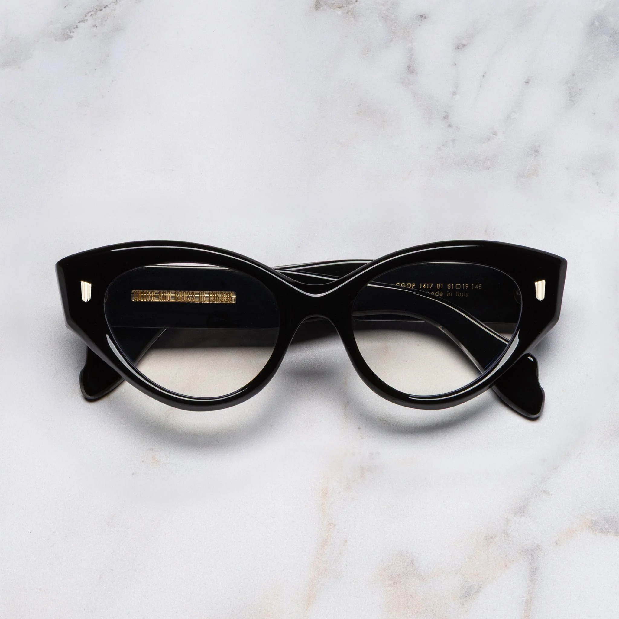 The cat-eye has been a Cutler and Gross centrepiece since the 70s, and this frame continues the evolution. It is shaped to a butterfly silhouette that balances a slim nose bridge with chunky temples, and detailed with Oyster and Compass Star pins. Details - Oyster frontal pins - Compass Star temple pins - Compass Star temple pins - 7-barrel hinges - Fender temples - Modernist core wire - Gold-foil logo on inner temple - Handcrafted in Italy by expert craftspeople, read more about our craftsmanship story - Need help? Read our full Glossary of Terms Size & Fit SKU: CGOP-1417-51-01 Frame shape: Cat Eye Lens width (mm): 51 Temple length (mm): 145 Bridge width (mm): 19