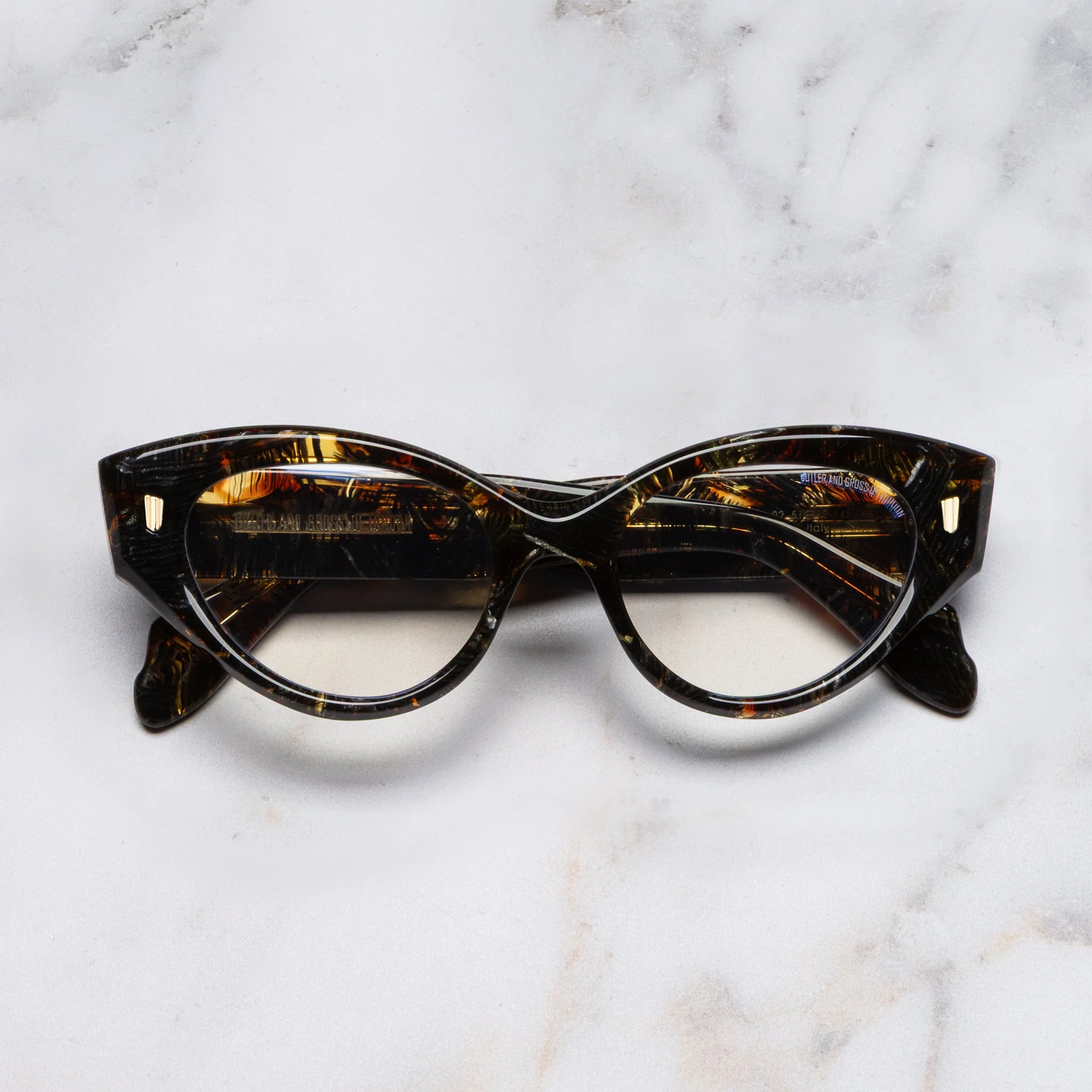 The cat-eye has been a Cutler and Gross centrepiece since the 70s, and this frame continues the evolution. It is shaped to a butterfly silhouette that balances a slim nose bridge with chunky temples, and detailed with Oyster and Compass Star pins. Details - Oyster frontal pins - Compass Star temple pins - Compass Star temple pins - 7-barrel hinges - Fender temples - Modernist core wire - Gold-foil logo on inner temple - Handcrafted in Italy by expert craftspeople, read more about our craftsmanship story - Need help? Read our full Glossary of Terms Size & Fit SKU: CGOP-1417-51-02 Frame shape: Cat Eye Lens width (mm): 51 Temple length (mm): 145 Bridge width (mm): 19