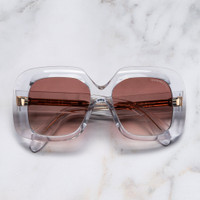 A collector's item, the 9891 Limited Edition frame is detailed with 18K Rose Gold-plated metalwork. The maximalist shape is sculpted with a swooping browline that extends up and around sunset-like gradient lenses. Details - 100% UVA and UVB lenses - Oyster frontal pins - Compass Star temple pins - 7-barrel hinges - Fender temples - Modernist core wire - Gold-foil logo on inner temple - Handcrafted in Italy by expert craftspeople, read more about our craftsmanship story - Need help? Read our full Glossary of Terms Size & Fit SKU: CGLE-9891-56-01 Frame shape: Rectangle Temple length (mm): 145 Lens width (mm): 56 Bridge width (mm): 17