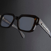 The Great Frog's rock'n'roll jewellery meets Cutler and Gross's acetate artistry with these square glasses. Hand cast in Sterling Silver, Bones Link and Dagger emblems gild the temples and frontal. The clean-cut shape is reverse-milled and threaded with Lock Down chain core wire. Details - The Great Frog Collection - Hand cast Sterling Silver Dagger frontal pins - 7-barrel hinges - Hand cast Sterling Silver Bones Link temple pins - Custom Lock Down chain core wire - Gold-foil logo inside temple - Plectrum temple tips - Handcrafted in Italy by expert craftspeople, read more about our craftsmanship story Size & Fit SKU: GFOP-005-52-02 Frame shape: Square Lens width (mm): 52 Temple length (mm): 150 Bridge width (mm): 20