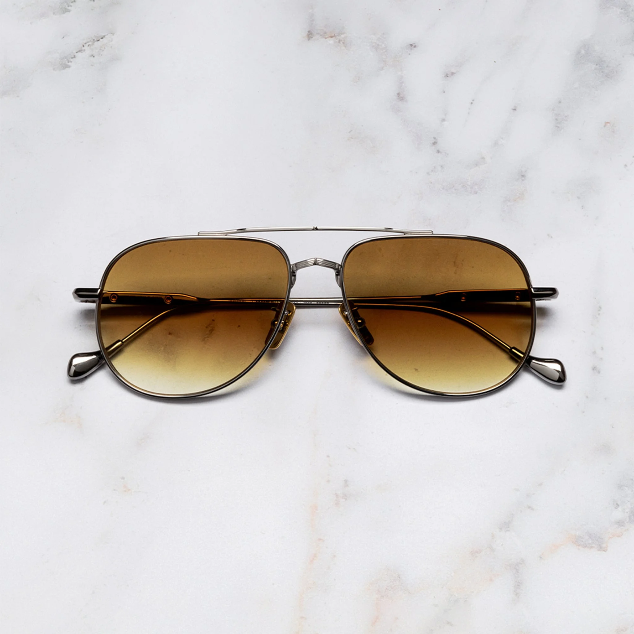 An amplified take on the aviator, created in collaboration with The Great Frog. The classic silhouette is animated with the Lock Down Chain motif, which comes to light on the double nose bridge and temples. Taking six months to create, the frames are handcrafted in Japan from pure titanium. A limited production of 250 frames. Details - Titanium - The Great Frog Collection - 100% UVA and UVB lenses - Engraved double nose bridge - Adjustable nose pads - Bones Link trim at temples - Logo engraved on inner temples - Handmade in Japan Size & Fit SKU: GFSN-018-56-01 Frame shape: Aviator Frontal width (mm): 145 Temple length (mm): 150 Lens width (mm): 56 Bridge width (mm): 15
