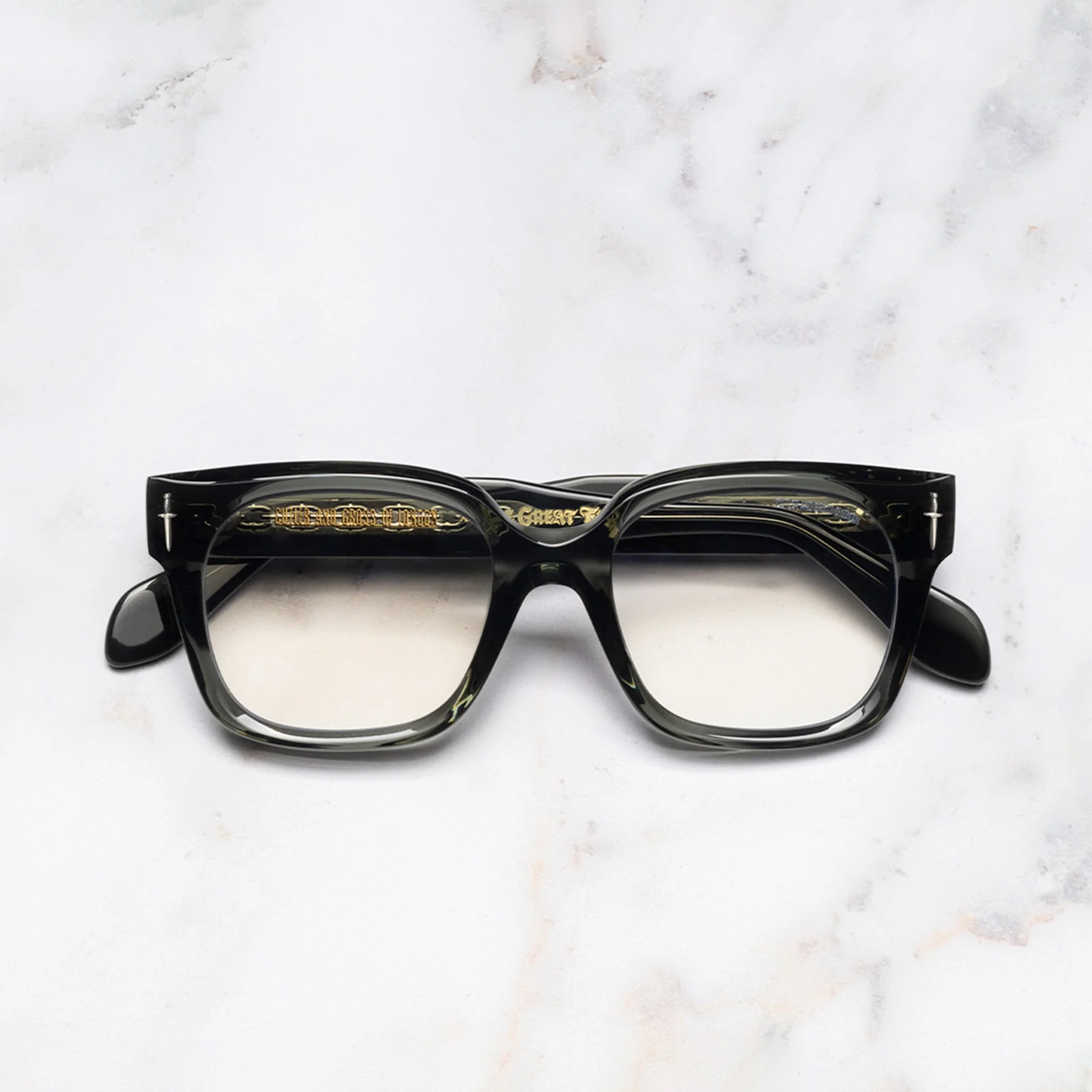Sterling Silver Daggers, an iconic The Great Frog motif, disrupt this striking optical. The square silhouette is softened with a curved browline that swoops down at the nose bridge. It is handcrafted in our atelier with internal and external bevelling, adding depth to the frame. A limited production of 250 frames. Details - The Great Frog Collection - Solid Sterling Silver metalwork - Dagger frontal pins - Big Eye temple pins - Plectrum temples - Lock Down Chain core wire - Gold-foil logo on inner temples - Handcrafted in Italy by expert craftspeople, read more about our craftsmanship story Size & Fit SKU: GFOP-024-51-03 Frame shape: Square Frontal width (mm): 140 Lens width (mm): 51 Temple length (mm): 150 Bridge width (mm): 19