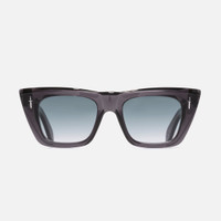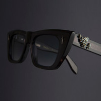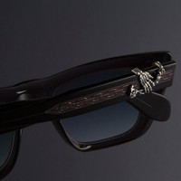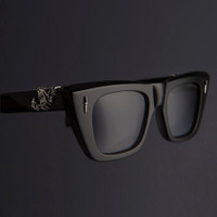 Drawing from The Great Frog's anarchic iconography, a skeletal hand clutching a rose wraps around the temple of this sunglass. It's handcrafted to a gender-bending cat-eye silhouette with a straight brow line. Two Sterling Silver daggers embellish the front, while Lock Down chain core wire structures the temples. Details - Handcrafted in Italy by expert craftspeople, read more about our craftsmanship story - The Great Frog Collection - Hand cast Sterling Silver Dagger frontal pins - 7-barrel hinges - Hand cast Sterling Silver Skull and Crossbones temple pins - Custom Lock Down chain core wire - Gold-foil logo inside temple - Plectrum temple tips - Need help? Read our full Glossary of Terms Size & Fit SKU: GFSN-008-51-03 Frame shape: Cat-Eye Temple length (mm): 150 Lens width (mm): 51 Bridge width (mm): 19