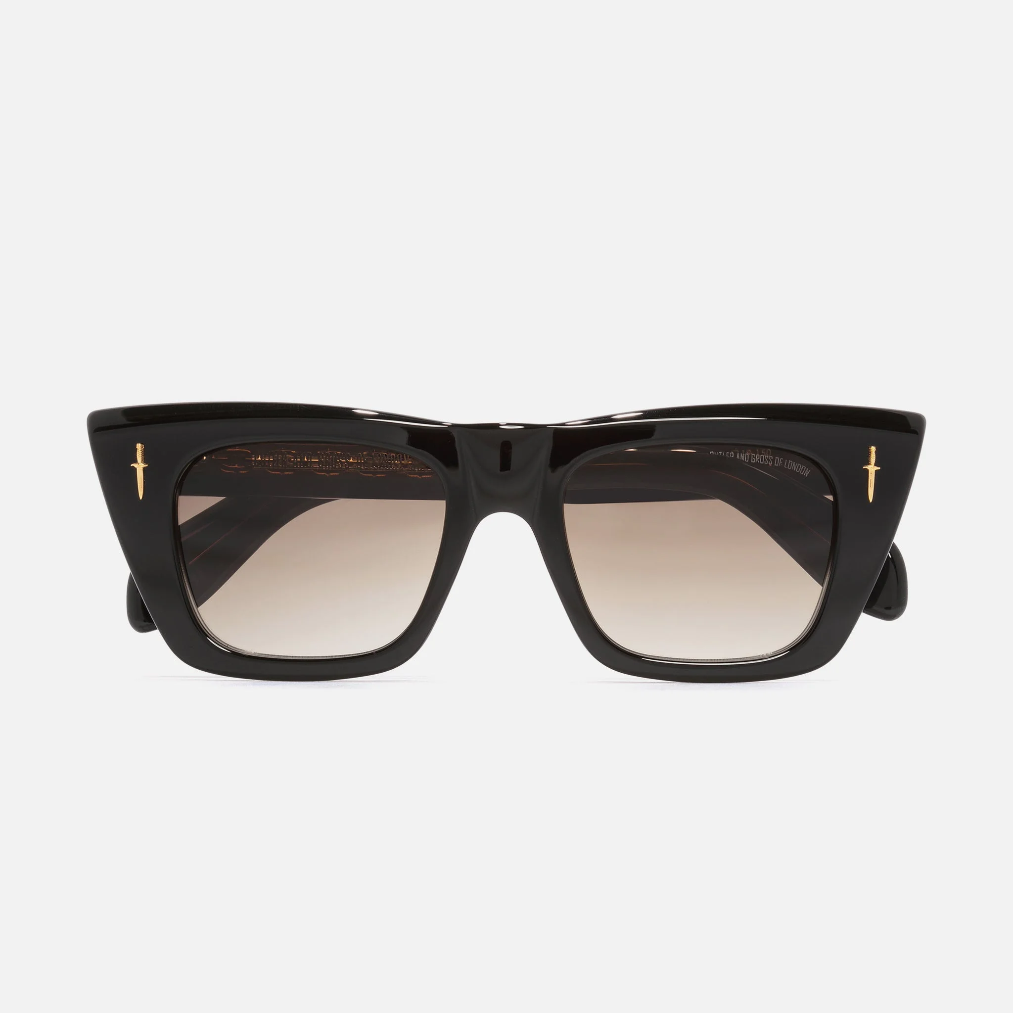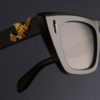24K Gold-plated details accent these limited edition cat-eye sunglasses, created in collaboration with The Great Frog. The Black frames are disrupted by a Gold, skeletal hand that wraps around the temple, clutching a rose. Two daggers mark the front of the gender-bending silhouette, which features a straight brow line and Plectrum tips. An exclusive run of 150 frames. Details - Handcrafted in Italy by expert craftspeople, read more about our craftsmanship story - The Great Frog Collection - Gradient lenses - Hand cast 24K Gold-plated Dagger frontal pins - 7-barrel hinges - Hand cast 24K Gold-plated Love And Death temple pins - Custom 24K Gold-plated Lock Down chain core wire - Gold-foil logo inside temple - Plectrum temple tips - Need help? Read our full Glossary of Terms Size & Fit SKU: GFLE-008-51-O1 Frame shape: Cat-Eye Temple length (mm): 150 Lens width (mm): 51 Bridge width (mm): 19