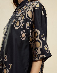 Perfect for walking through cobblestone streets or on grotto getaways. Subtle metallic gold foil printed on a lightweight silk fabric. Throw over your bikini for the beach and style into the night with your favorite sequin skirt. - Spring/Summer 25’ - Composition: 100% Silk - Relaxed fit - Dry clean recommended - Fit: model is 5'9" and wears a size S. - Size S measurements: - Length from shoulder: 27"