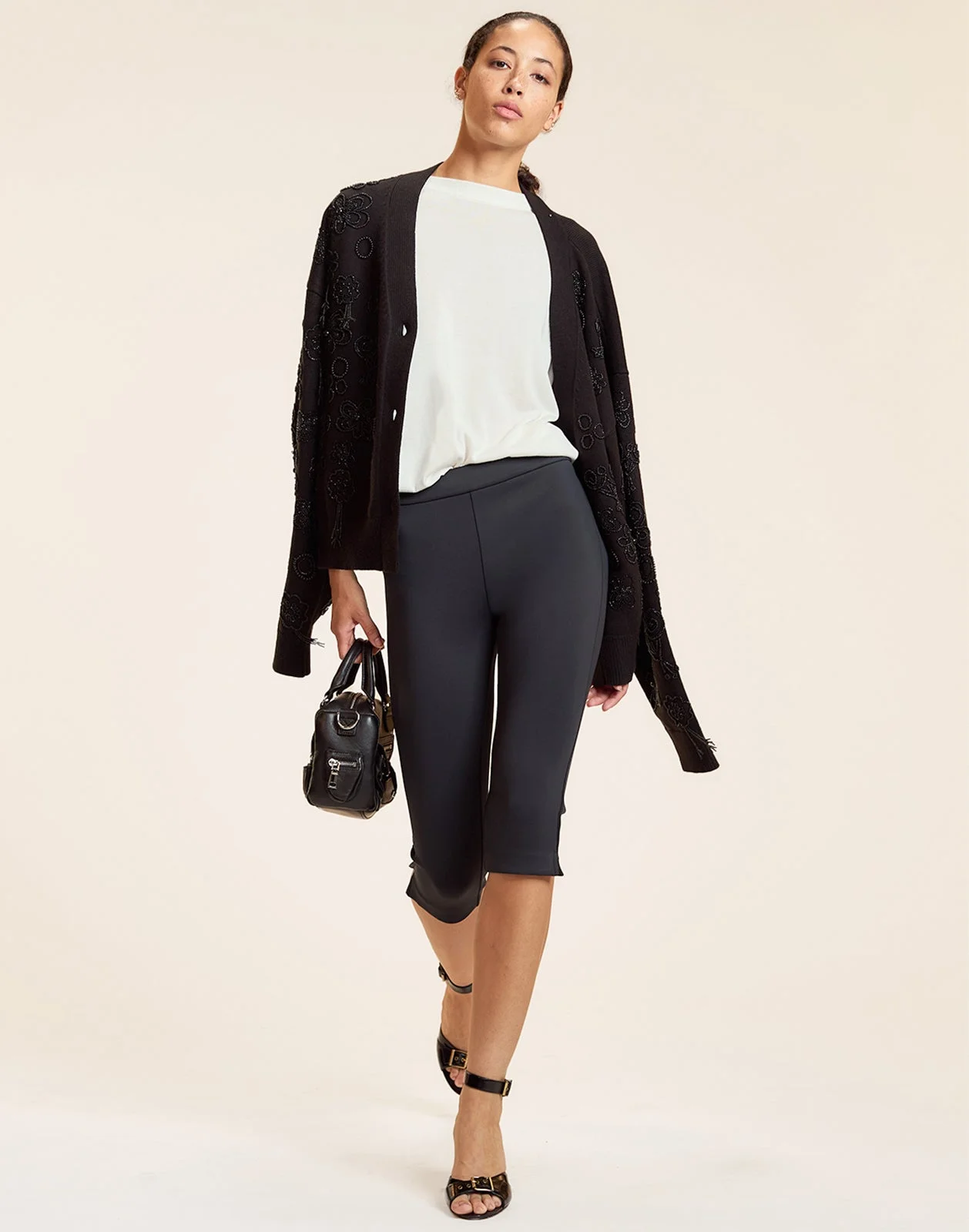 Everyone’s favorite buttery-soft bonded fabric, now reimagined in a capri silhouette. Flattering and made for all-day comfort. - Fall '25 - Composition: 86% Polyester, 14% Spandex Bonded - Exposed zipper detail at center back - Slim fit - High rise - Stretch - Machine wash cold, hang dry, but dry clean recommended. - Fit: model is 5'9" and wears a size 2 - Size 2 measurements: - Inseam: 15" - Outseam: 26"