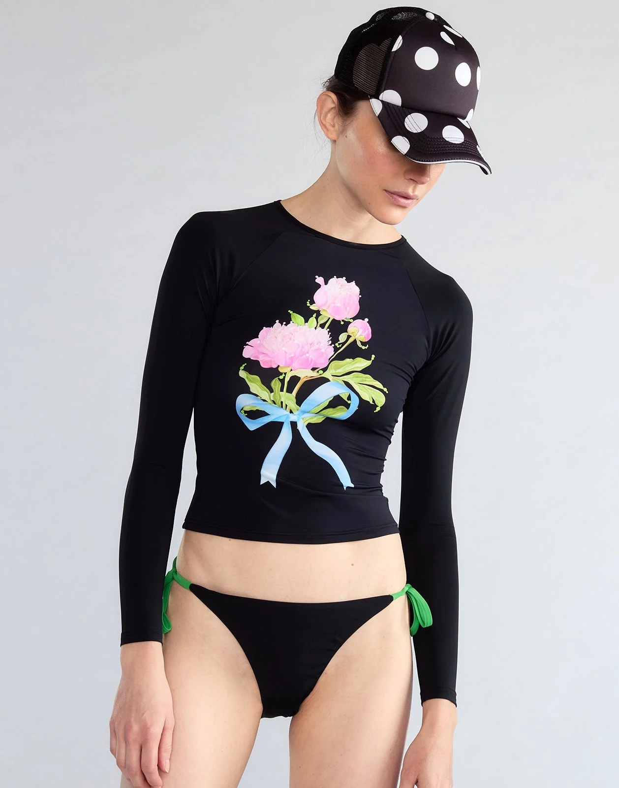 Black bouquet ribbon rashguard. FINAL SALE - Non-returnable - Slight cropped fit - Long sleeves - Soft buttery fabrication - SPF 30+ - Peony bouquet ribbon print - Fabric content: 100% polyester - Care instructions: hand wash, hang or lay flat to dry Fit: model is 5'9" and wears a size S. Size S measurements: - Length of sleeve: 24" - Length down center back: 17" Complete the look: Becca Bikini Bottom Swim is non-returnable due to sanitary reasons. Final Sale