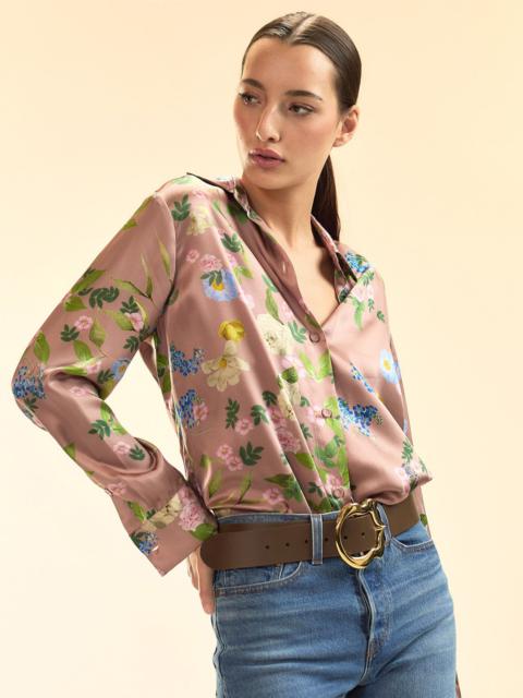 Long sleeve silk button down shirt with all over floral print - Regular fit - Button-down front - Covered fabric buttons - Curved hem - Floral print - Fabric content: 100% silk - Care instructions: dry clean only Fit: model is 5'9" and wears a size S. Size S measurements: Length from shoulder: 26.5" Complete the look: - The Everyday Jeans - Bloom Silk Scarf
