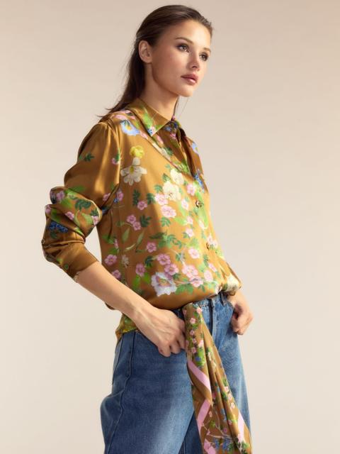 Long sleeve silk button down shirt with all over floral print - Regular fit - Button-down front - Covered fabric buttons - Curved hem - Floral print - Fabric content: 100% silk - Care instructions: dry clean only Fit: model is 5'9" and wears a size S. Size S measurements: Length from shoulder: 26.5" Complete the look: - The Everyday Jeans - Bloom Silk Scarf
