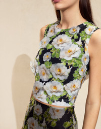 Pretty flowers bloom on this sporty silhouette. Stretched tulle with silk organza 3D floral appliques. Dress it up with your favorite black blazer for a night out. - Spring/Summer 25' - Composition: 100% Silk - Fully lined - Special dry clean recommended, store in garment bag - Fit: model is 5'9" and wearing size S. - Size S measurements: - Length: 17”
