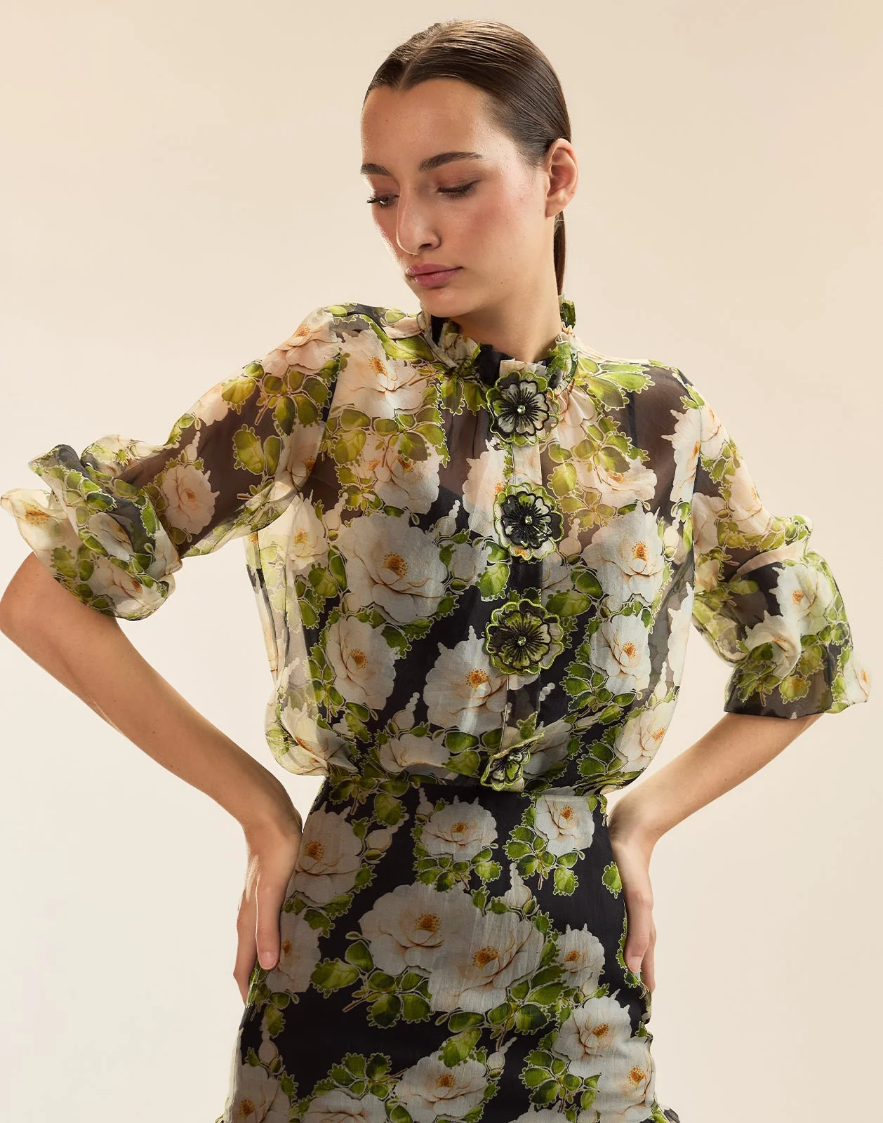 Crafted from silk organza, this blouse is embellished with three-dimensional floral applique buttons that feature jewel centers – adding a minimal yet delicate detail. The ruffled neckline, softly puffed sleeves and floral print lend a touch of femininity. Complete this look with the Cornelia Silk Skirt and Cece Wrap Heel for something more elevated, or throw on with a pair of high rise denim to dress it down. Either way, this silk blouse will speak for itself. - Composition: 100% Silk Organza - Dry clean only - Fit: model is 5'9" and wearing size S. - Size S measurements: - Length down back: 23''