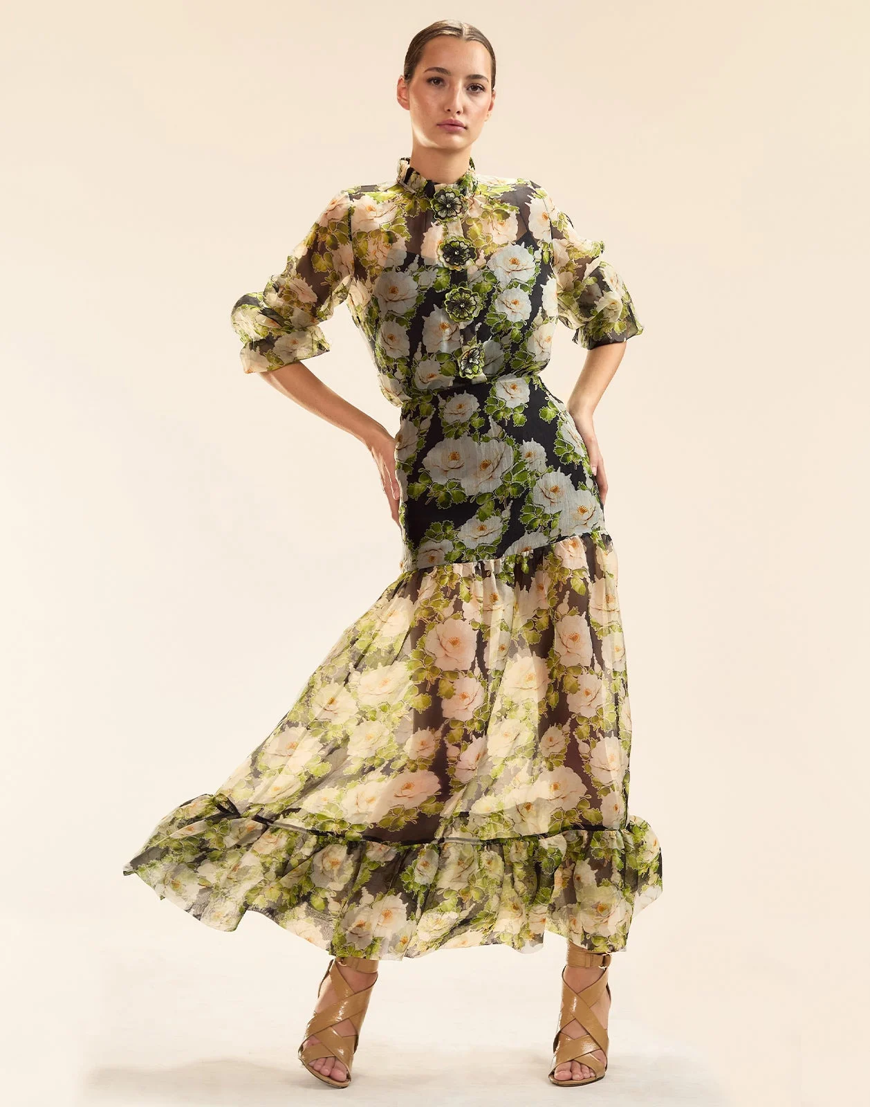 Silk organza for all summer long. This maxi skirt has a fitted waist and tiered bottom ruffle that brings movement and sheer delight to every step. Style with the Cornelia Organza Blouse and Cece Wrap Heel, or throw on the Elea Wool Cashmere Sweater. - Spring/Summer ‘25 - Composition: 100% Silk - Half lined - Detachable slip, can be worn with or without - Dry clean only - Fit: Model is 5’9 and wears a size 2 - Size S Measurements: - Length: 40”