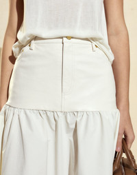 This skirt is all about contrast in the best way. A leather mid-rise waist meets a lightweight nylon body, creating effortless shape. Pair it with the Mica Sleeveless Knit Top for everyday dressing or the London Leather Button Up Shirt for a more elevated look. - Spring/Summer ‘25 - Composition: 100% Leather top, 100% Nylon bottom - Clean by leather specialist - Fit: Model is 5’9 and wears a size 4 - Size 4 Measurements: - Waist 30" - Hip 38" - Length: 34"