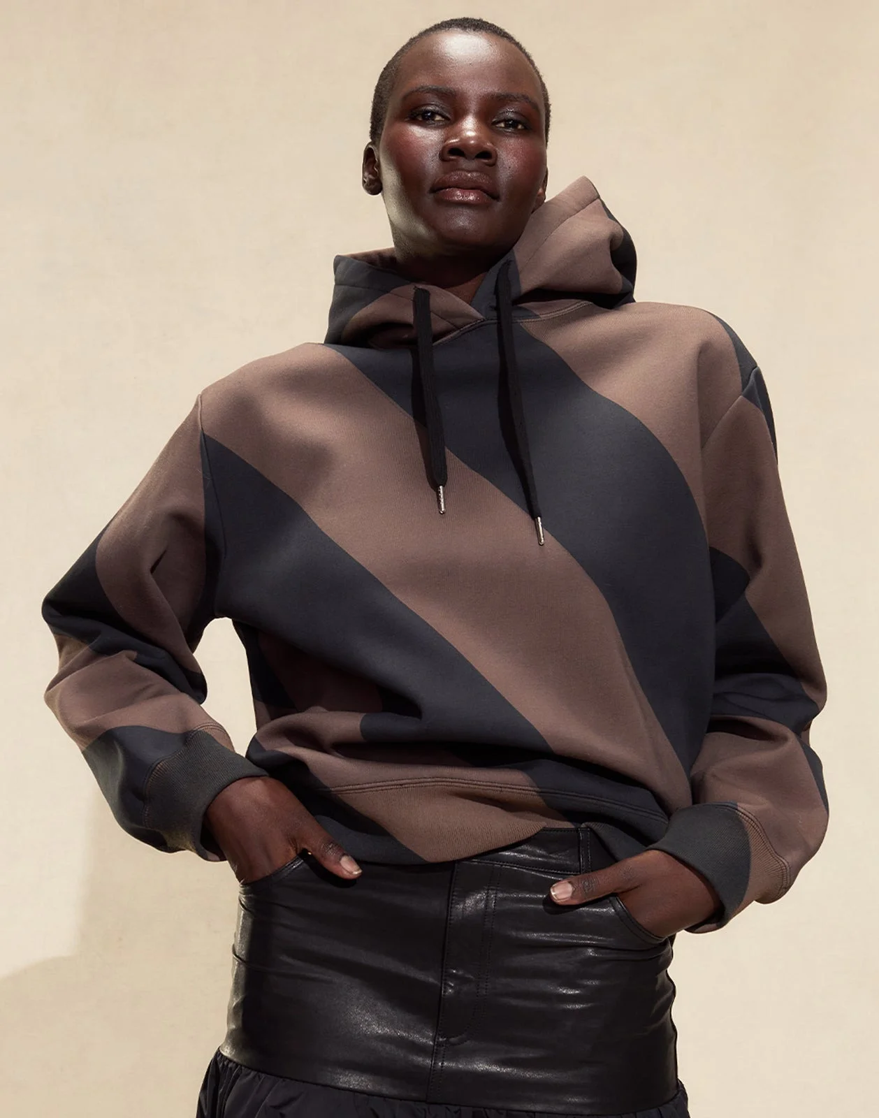 A classic off-duty essential. With oversized diagonal stripes and a relaxed shape, this hoodie has the perfect form and fit. Designed to elevate your loungewear collection, this hoodie can be dressed up with the Downtown Leather Nylon Skirt and Cece Wrap Heel, or dressed down with your favorite denim. - Spring/Summer 25' - Composition: 100% cotton - Machine wash cold, tumble dry low - Fit: model is 5'9" and wears a size S - Size S measurements: - Length: 26"