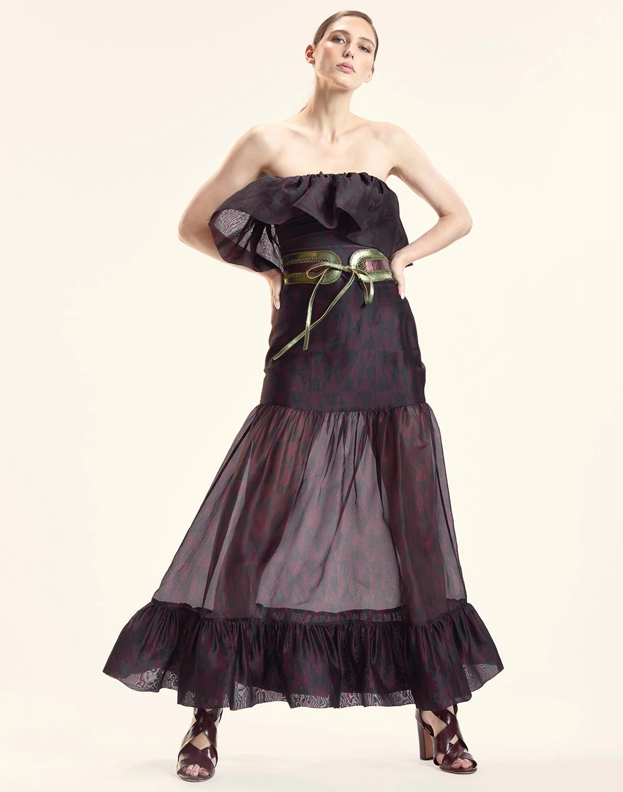 Our best selling silhouette in a burgundy and black geometric-print. Pair with the matching blouse or your favorite tee. - Fall '25 - Composition: 100% Silk - Half lined - Detachable slip, can be worn with or without - Dry Clean Only - Fitted top, billowy through hem - Mid-To High-Rise Fit - No Stretch - Fit: model is 5'9" and wears a size 4. - Size 4 measurements: - Waist: 27" - Hip: 37" - Length: 40”