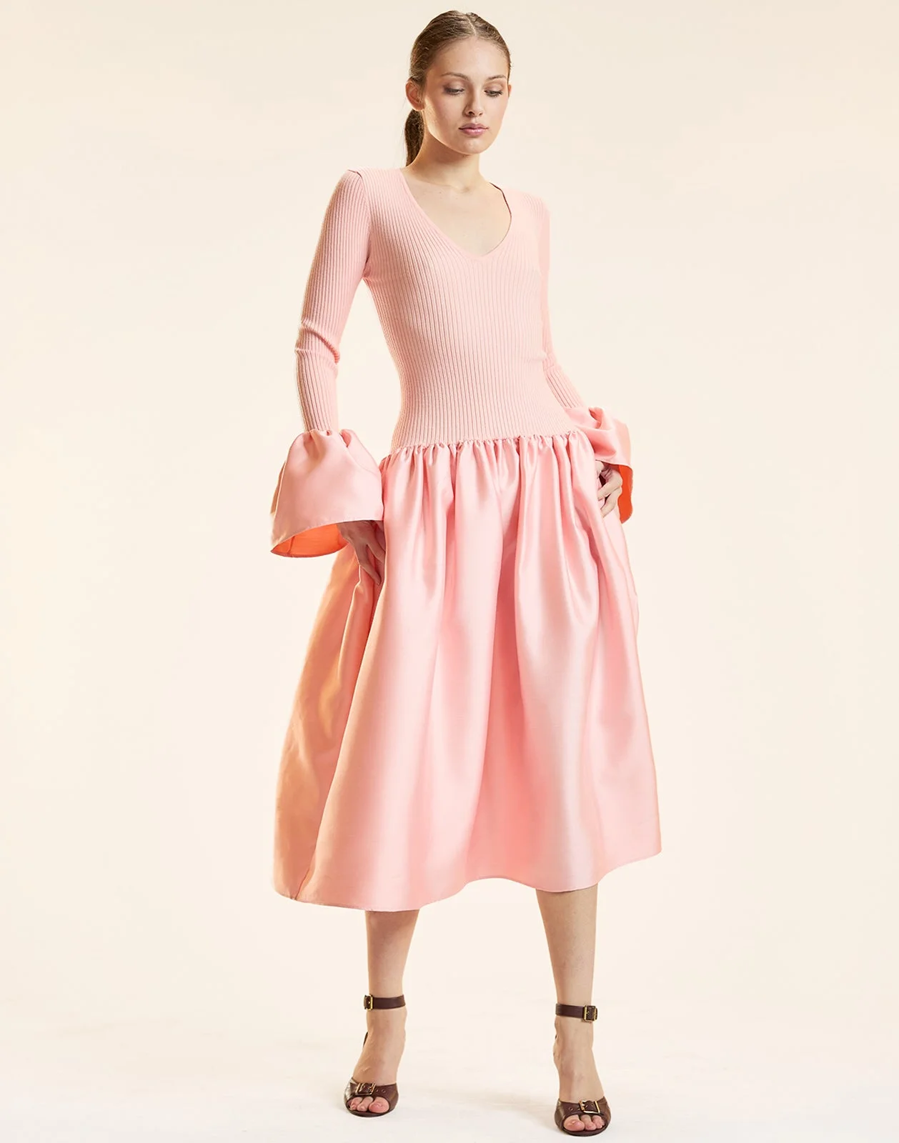 Easy rib knit top with a polished statement silk skirt and sleeves. The perfect piece to add to your evening wear collection. - Composition: 25% silk, 25% wool, 25% viscose, 25% polyamide - Unlined - Pull-on-style - V-neckline - Fitted bodice - Bodice has stretch, skirt is non-stretch - Side pockets - Dry clean only - Fit: model is 5'9" and wears a size S - Size S measurements: - Full length: 50" - Sleeve length: 18.5" - Waist: 10" - Front neck drop: 9"
