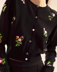 Pretty floral embroidered baby cashmere cardi. Cute enough to wear solo, but also loves layering. Your new year-round go to when you’re looking for a hint of girly (without trying too hard). - Spring/Summer 25' - Composition: 70% Wool, 30% Cashmere - Hand wash, hang to dry - Fit: Model is 5’9 and wears a size S - Size S Measurements: - Length: 19"