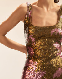 This dress, a cocktail plus golden hour lighting. The perfect mini with sequin floral intarsia motif. - Spring/Summer '25 - Composition: 100% Polyester - Dry Clean Only - Fit: model is 5'9" and wears a size 2. - Size 2 measurements: - Shoulder to hem: 31”