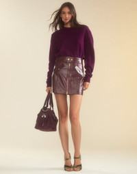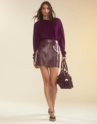 Textured vegan patent leather mini skirt in oxblood FINAL SALE - Non-returnable - Front zipper with gold hardware - Textured vegan leather - Glossy finish - Gold snap buttons - Two front flap pockets with gold button accents - High-waisted, A-line silhouette - Mini skirt - Fabric content: 50% polyester, 50% PU - Care instructions: dry clean only Fit: model is 5'9" and wears a size 2. Size 2 measurements: - Length: 16.5'" Complete the look: - Ardie Striped Rugby Shirt - Elea Wool Cashmere Sweater