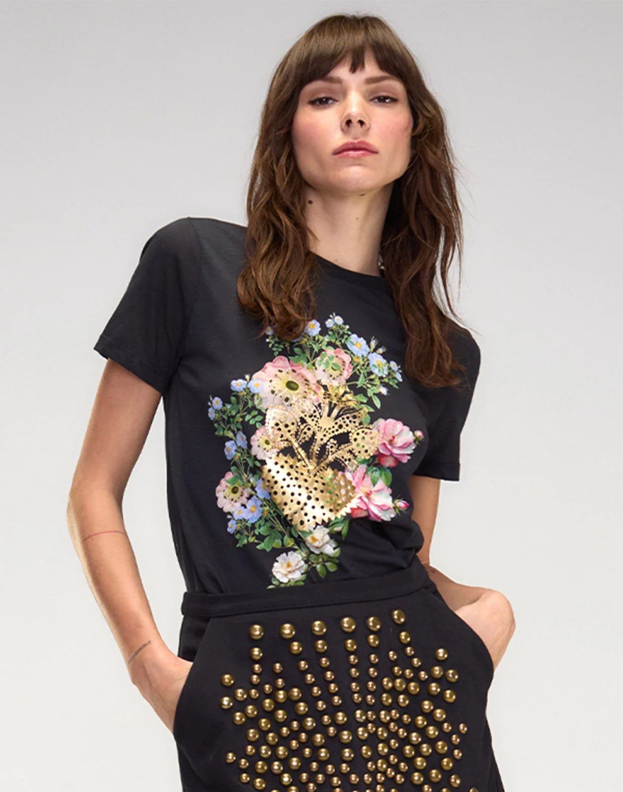 One for every day of the week! - Gold foil printed heart - Floral motif - Soft-spun cotton, soft to touch - Fabric content: 100% cotton - Care instructions: machine wash cold Fit: model is 5'8" and wears a size S Complete the look: Serena Studded Denim Skirt