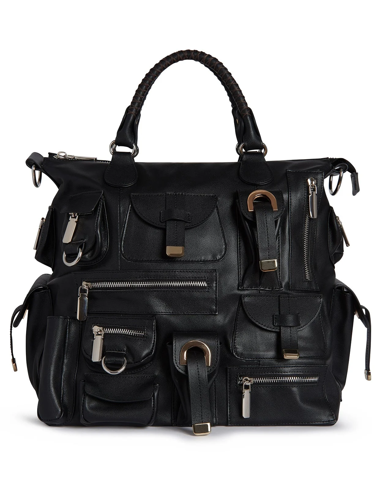 Black Leather Cargo Pocket Top Handle Bag - Functional all over cargo pockets with polished silver-tone hardware - Soft leather exterior in black - Top handle straps - Secure top zipper closure for the main compartment - Premium leather with a structured silhouette - Detachable crossbody strap - Fabric content: 100% leather - Dimensions: - Width 14'' - Height 14 1/2'' - Handle drop 3'' - Depth 8''
