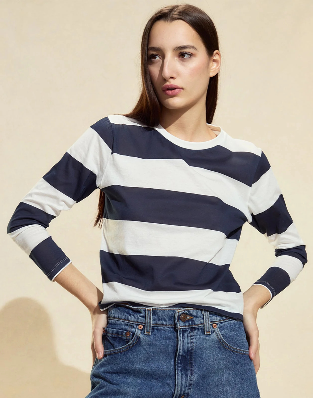 A classic long sleeve you’ll reach for year-round. This soft tee features a timeless horizontal striped pattern, double needle stitched detailing and effortless relaxed fit. Feel comfortable, but look put together. Pair with your favorite denim and go-to tote for a functional, everyday look. - Spring/Summer 24' - Composition: 100% combed and ring-spun cotton - Machine was cold, tumble dry low - Fit: model is 5'10" and wears a size S.
