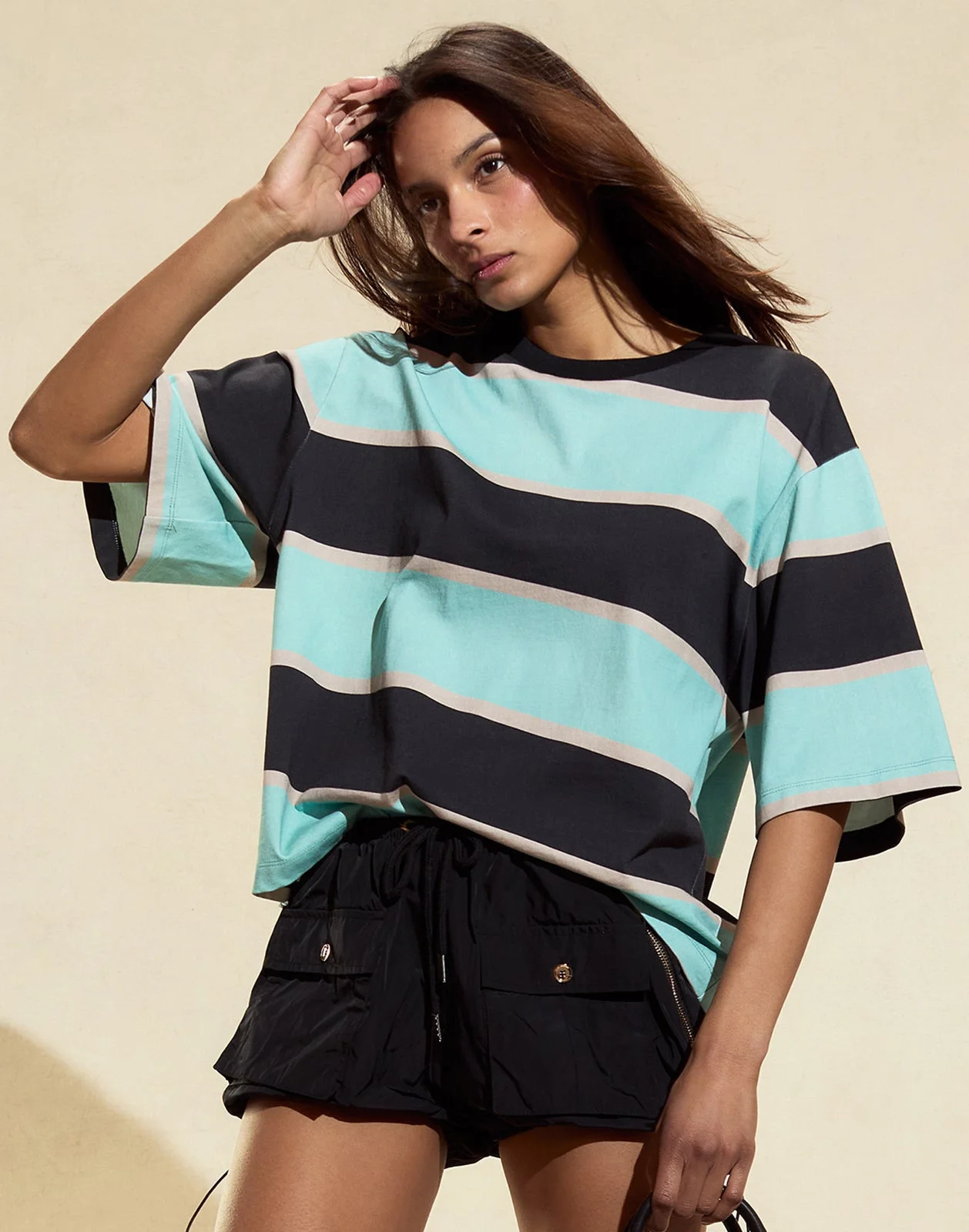 Easy and oversized woven stripe tee, throw this on for an effortlessly cool look. With an easy, relaxed fit, and woven stripes, you'll find yourself wanting to wear this everyday. - Spring/Summer 25' - Composition: 100% cotton - Machine wash cold - Fit: Model is 5'9 and wearing a size S. - Size S Measurements: - Shoulder to hem: 25"