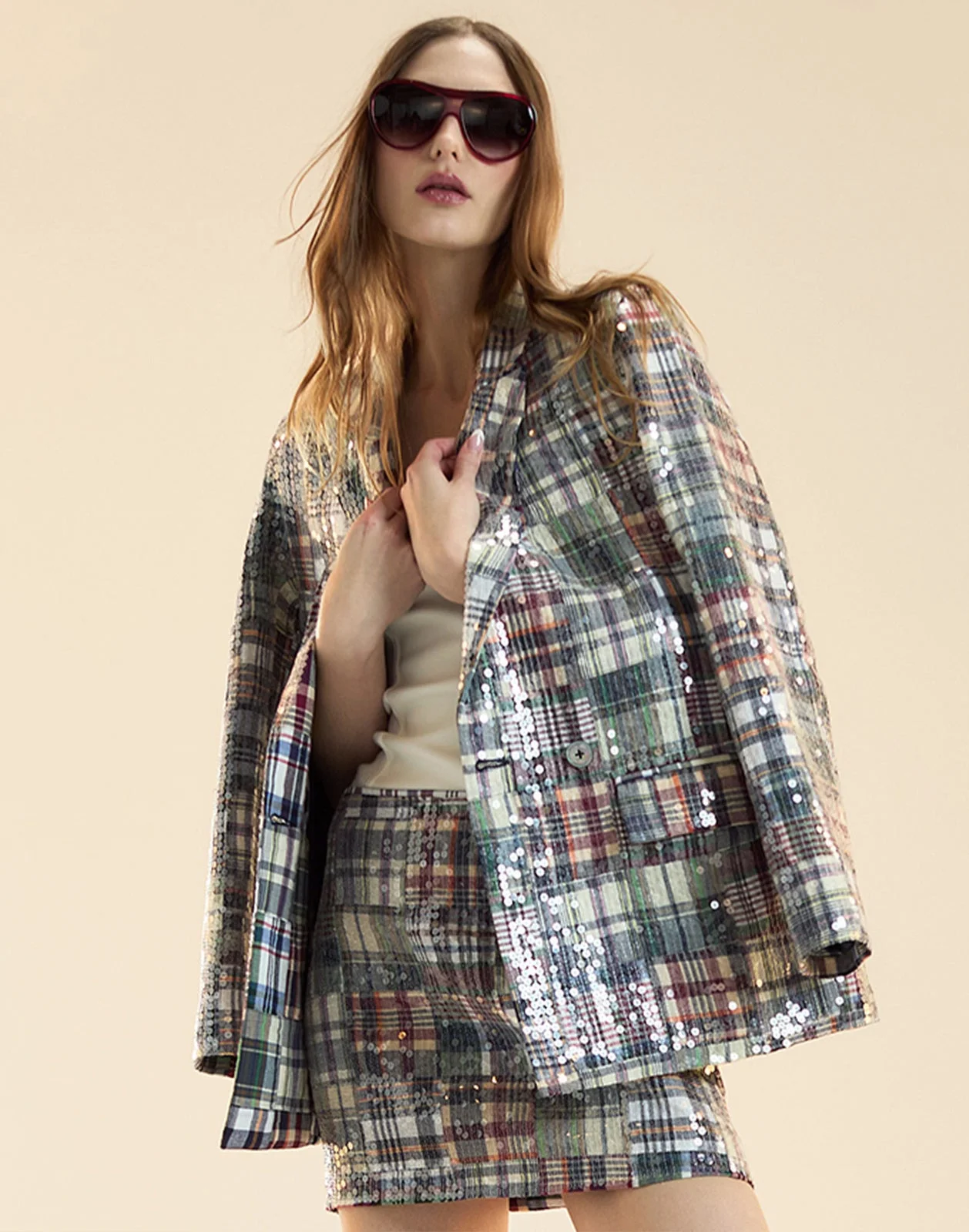 Sequin glaze takes over classic patchwork madras for a preppy polished look. Throw over a slip dress and take on the night. - Spring/Summer 25' - Composition: 100% Cotton - Dry clean only - Fit: model is 5'9" and wears a size S. - Size S measurements: - Length: 28”