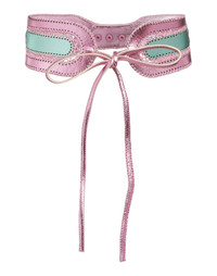 Mixed Metallic Vegan Leather Belt. - Metallic pink and green panels - Intricate stitch detailing - Adjustable three snap closure - Pink metallic tie - Created for versatile styling: can be worn on the waist or hip - Fabric content: 100% vegan leather - Care instructions: dry clean only Length: 28''-31'' Final Sale