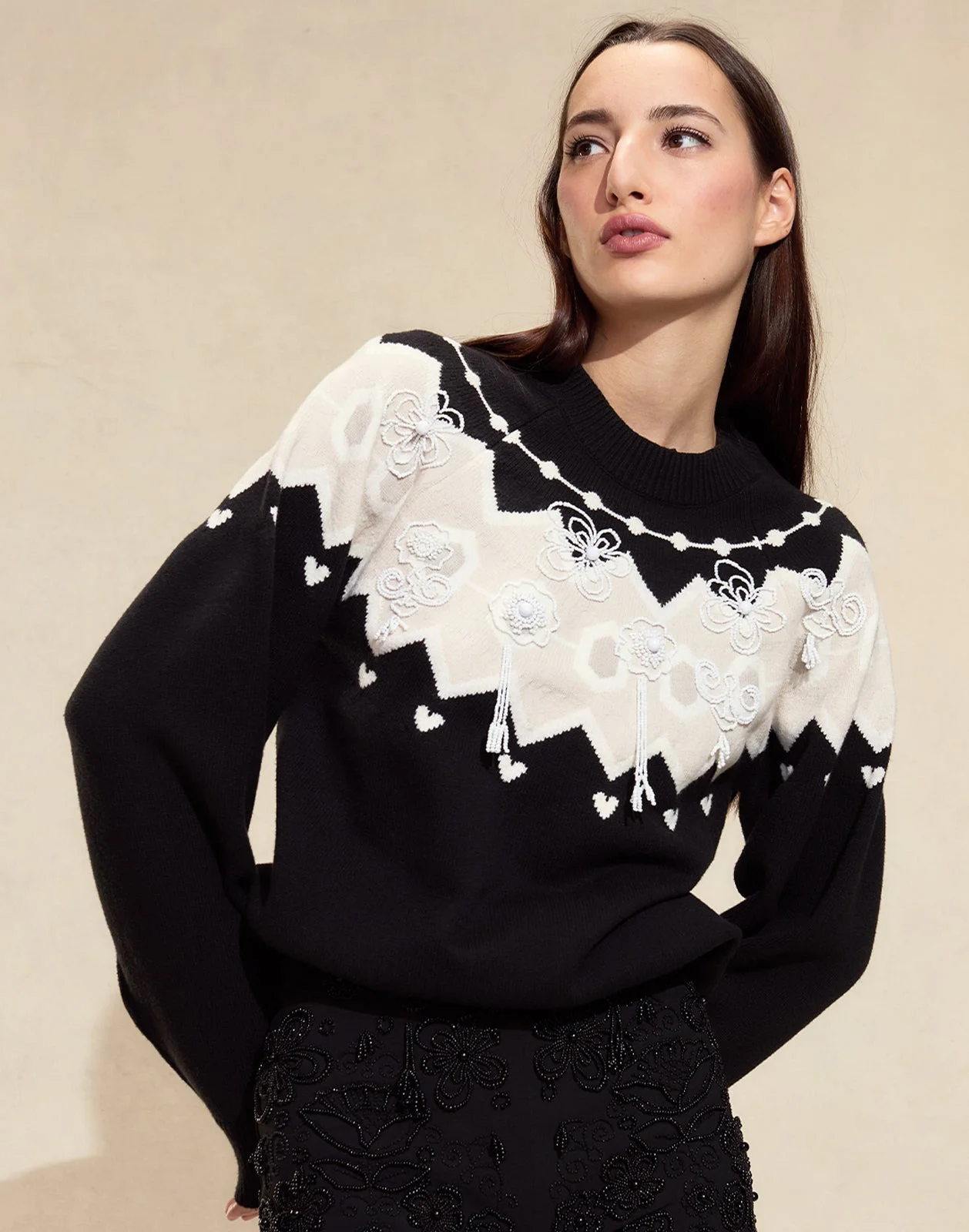 This sweater has seed bead embroidery and a detailed black and white geometric knit pattern. The tassel accents add movement, while a ribbed neckline and cuffs ground the silhouette in classic structure. Elevate this sweater with the Paloma Shorts and Cece Wrap Heel for a unique and unforgettable look. - Spring/Summer 25' - Composition: 35% acrylic, 35% cotton, 30% polyester - Dry clean recommended - Fit: model is 5'9" and wears a size S. - Size S measurements: - 23 1/2"