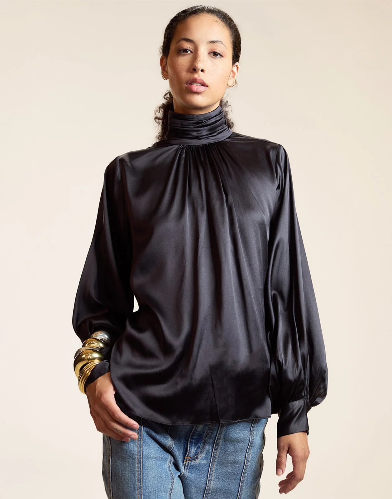 Inspired by our best-selling silk dresses, this blouse captures the same effortless, romantic feel—easy to wear and endlessly versatile. - Composition: 100% Silk - Balloon sleeves with buttoned cuffs - Invisible back-zipper closure - Gathered high neckline - Relaxed fit - No stretch - Dry clean only - Fit: model is 5'9" and wearing size S - Size S measurements: - Body length: 25.75" - Sleeve length: 25.25"
