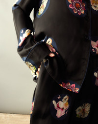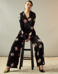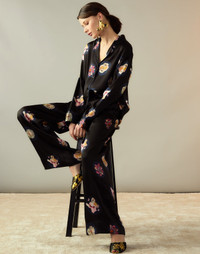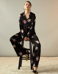 Silk pajama pant with floral graphic print. - Elastic waist band with grosgrain drawstring - Wide leg silhouette - Side pockets - Relaxed fit - Fabric content: 100% silk - Care instructions: dry clean only Fit: oversized fit, model is 5'10" and wears a size S. Size S measurements: Inseam: 27.5"Length: 37.5" Styled with the: Moonlit Petal Blouse & Metallic Gold Foil Satin Wedges