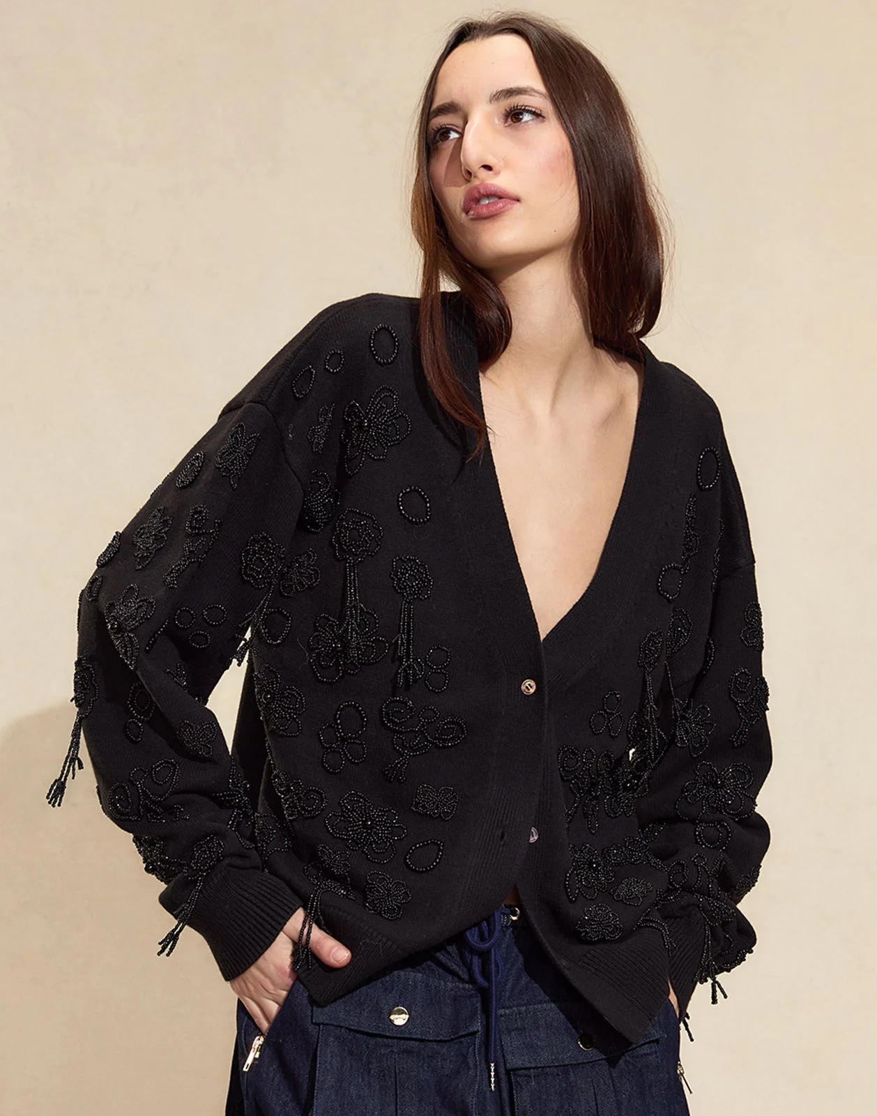 Not your boyfriend's oversized sweater. Hand beaded with seed bead embroidery, perfect to throw on and complete any look. Wear it draped over your shoulders with a little slip dress, with the beaded Paloma Shorts or even your favorite denim. - Spring/Summer 25' - Composition: 35% acrylic, 35% cotton, 30% polyester - Hand wash or dry clean - Fit: model is 5'9" and wears a size S. - Size S measurements: - Length: 24" - Neck depth: 11"