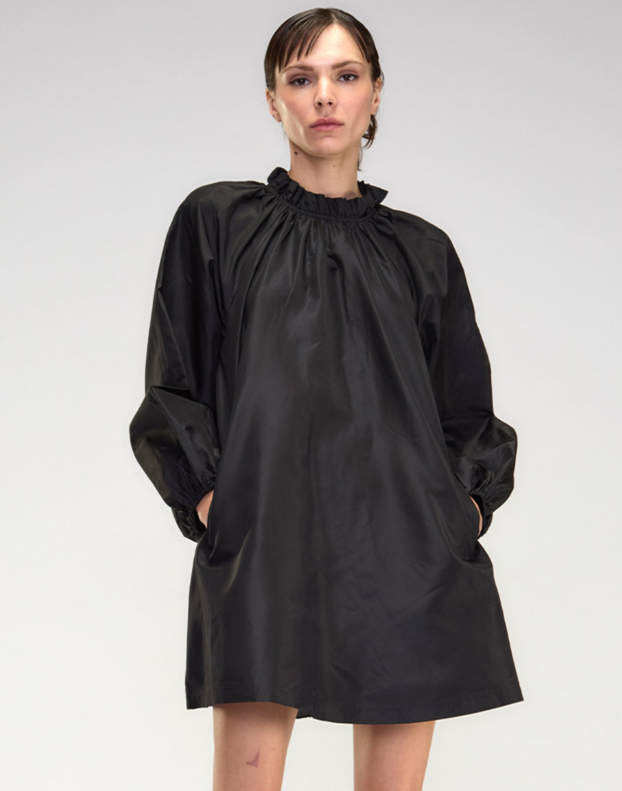This black silk taffeta dress will make choosing an outfit easier than ever. The relaxed silhouette and airy silk taffeta give it easy movement, while the gathered mock neckline and balloon sleeves give it a cool vibe. Throw it on with the Cece Wrap Heel and the Felicity Fringe Suede Tote, and you’re good to go. Layer it with a long coat when the weather cools down, or wear it solo when it’s warm out—it’s the kind of piece that just works, no matter the weather. - Fall/Winter 24' - Composition: 100% Silk - Machine wash cold, hang dry - Fit: Model is 5’9 and wears a size S - Size S Measurements: - Length: 32”