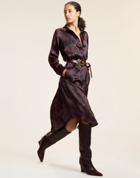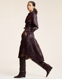 An airy silk charmeuse shirt dress in a unique black and burgundy print. Lightweight, comfortable, and perfect for any occasion. - Fall '25 - Composition: 100% Silk - Unlined - Dry clean only - Button-up style - Collared neckline - Relaxed silhouette - Side pockets - Fit: model is 5'9" and wears a size S - Size S measurements: - Length from back: 45.5" - Length from front: 42.5"