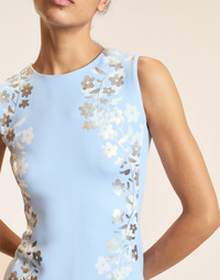 Our signature bonded fabric, reimagined in a flattering sleeveless baby blue midi dress with subtle silver metallic detailing. - Composition: 86% Polyester, 14% Spandex - Unlined - Invisible back-zipper closure - Round neckline - Fitted - Stretch - Machine wash cold, hang dry - Fit: model is 5'9" and wears a size 2 - Size 2 measurements: - Front length: 47" - Bust: 15"