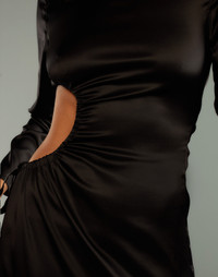 The Striking Silk Dress redefines sophistication with a glimpse of skin that exudes confidence and elegance. - Body skimming silk with side cut out - Flattering ruched side cut out with adjustable tie at waist - Fitted long sleeves with button closure at the cuff - Key hole opening in the back - Side slit - Maxi length - Fabric content: 100% silk - Care instructions: dry clean only Fit: model is 5'9 and wears a size 2. Size 2 measurements: - Length from shoulder: 57" Exchange Only