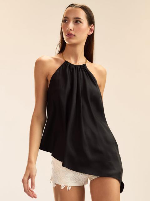 Black or white silk twill halter attached to a gold tone choker. Super chic and modern, the perfect summer getaway top. - Spring/Summer '25 - Composition: 100% Silk - Gold-tone neck ring - Dry clean only - Fit: model is 5'9" and wears a size S. - Size S measurements: - Center front length: 21.5” - Bust width: 14”