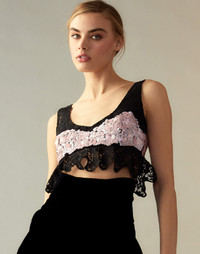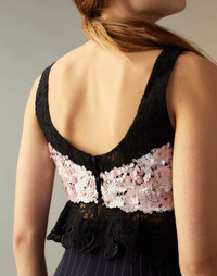 Light pink sequined lace Top. - Black lace panelling - Light pink sequin embellishment - Ruffle lace hem - Cropped - Sleeveless - Scoop neckline - Back button closing - Fabric content: 100% polyester - Care instructions: hand wash cold recommended Fit: model is 5'10" and wears a size S. Size S measurements: 15'' Complete the look: The Cosmo Sequin Skirt & Corset Waist Pants Final Sale