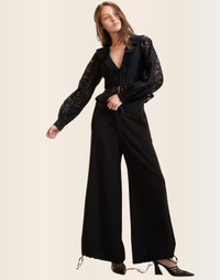 The perfect date night top. Great with jeans or leather pants. Pretty, sexy, weekend ready. - Composition: 100% Polyester Lace - Partially lined - Balloon sleeves with buttoned cuffs - Hook and eyes front closure - Ruffle V-neckline - Slight stretch - Dry clean only - Fit: model is 5'9" and wears a size 2 - Size 2 measurements: - Length from shoulder: 20" - Waist: 27" - Sleeve Length: 24 3/4" - V-neck drop from shoulder: 12"