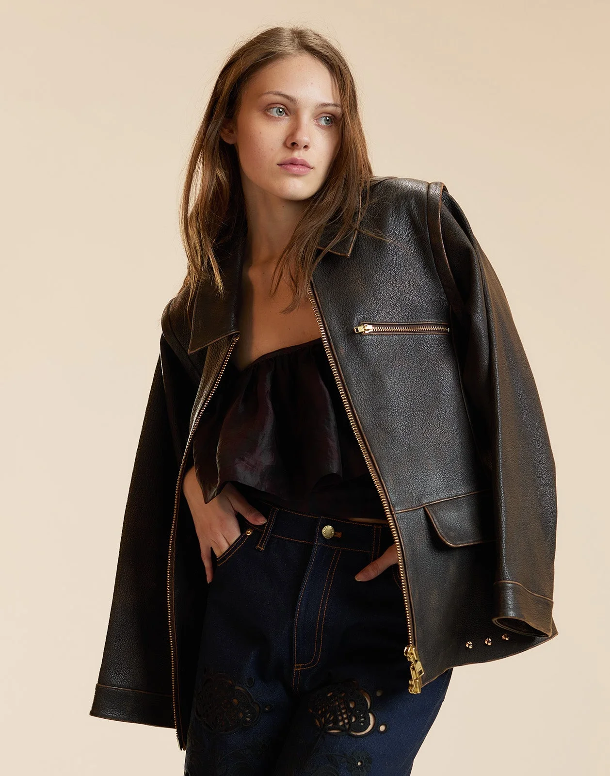 A 90's inspired staple piece in every cool girls closet. - 100% Lamb Leather - No stretch - Clean by a leather specialist - No stretch - Button down, cropped fit - Fit: Model is 5'9" and wears a size s - Size S measurements: - Length: 18" - Sleeve length: 23"