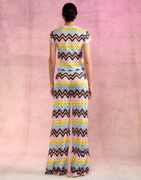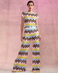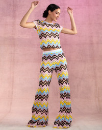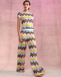 Slip into these knit zigzag pant. Light pink and blue striped ribbed elastic waistband Floor length Straight leg with slight flare bottom High waisted Breathable open knit fabric Designed to be worn from day to night Fabric content: 100% polyester Care instructions: machine wash cold, hang dry Fit: model is 5'9" and wear a size S. Size S measurements: - Length: 47” - Inseam: 34” Complete the look: - Birdcage Mary Janes - Mixed Metallic Vegan Oversized Tote - Zigzag Knit Tee Final Sale