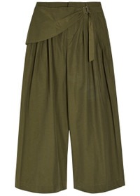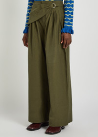 Info & Care Damson Madder cotton-blend trousers Adjustable wrap detail with metal D ring at pleated waist, belt loops, two side slip pockets, two button-fastening back pockets, designer embroidery at back pocket Concealed zip and hook fastening 51% organic cotton, 49% recycled polyamide Machine wash inside out Size & Fit Inside leg length: 28 inches/ 71cm Midweight Wide-leg cut Model is 5'9"/ 175cm and wears a size 8