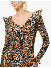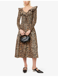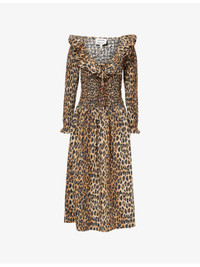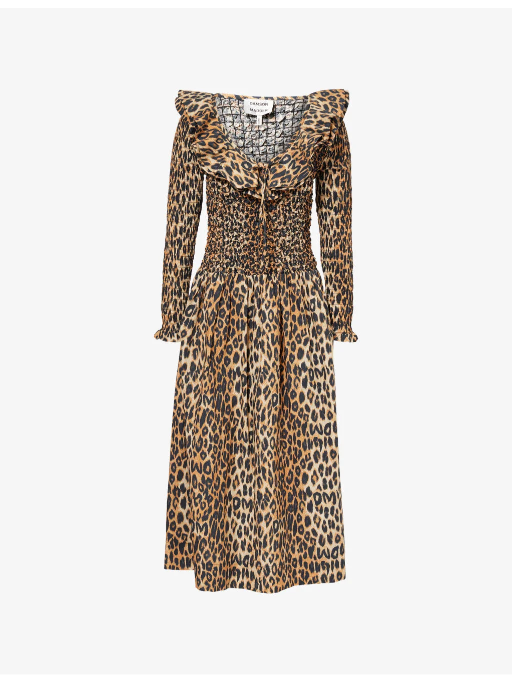 PRODUCT DETAILS - Damson Madder cotton midi dress - 100% cotton - Regular fit, scoop neckline with ruffle trim, long sleeves, shirred design, leopard print, flared hem - Machine wash cold - True to size - Model is 5ft 10in/1.78m and wears a size UK 8 - Lightweight, non-stretch Ref: R04552368