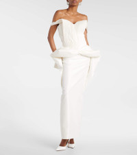 Product Details - Material: 100% silk - Care instructions: dry clean - Made in the USA - Designer color name: Light Ivory - Lining: 100% polyester - Closure: zipper, hook fastening, self-ties - Item number: P00872363 Size & Fit - True to size - Low back - Off-the-shoulder - Internal boned corset for support - Fitted bodice, loose skirt - Non-stretchy fabric - Padded top - slit length 43,0cm-17" - The model seen in the picture is 178cm-5'10" and wearing a size US 4