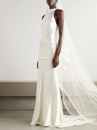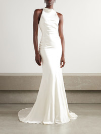 Danielle Frankel’s ‘Stella’ gown is a sleek, timeless style that beautifully showcases your silhouette. It's bias-cut from lustrous silk and wool-blend satin to drape beautifully over your frame and has an elegant high neckline. The open back is tempered by slim straps tipped with faux pearls. The train will flow beautifully behind you as you walk toward your future. Size & Fit - Fits true to size, however those who are between sizes should take the smaller size - Designed for a slim fit - Train hem - Mid-weight, non-stretchy fabric - Model is 180cm/ 5’11” and is wearing a US 2 Model measurements: - Bust: 80cm/ 31.5" - Waist: 65cm/ 25.5" - Hip: 91cm/ 36" Details & Care - White silk and wool-blend satin - Ties and concealed hook and zip fastening at back - 51% silk, 49% wool; lining: 100% polyester - Dry clean - Designer color: Pearl