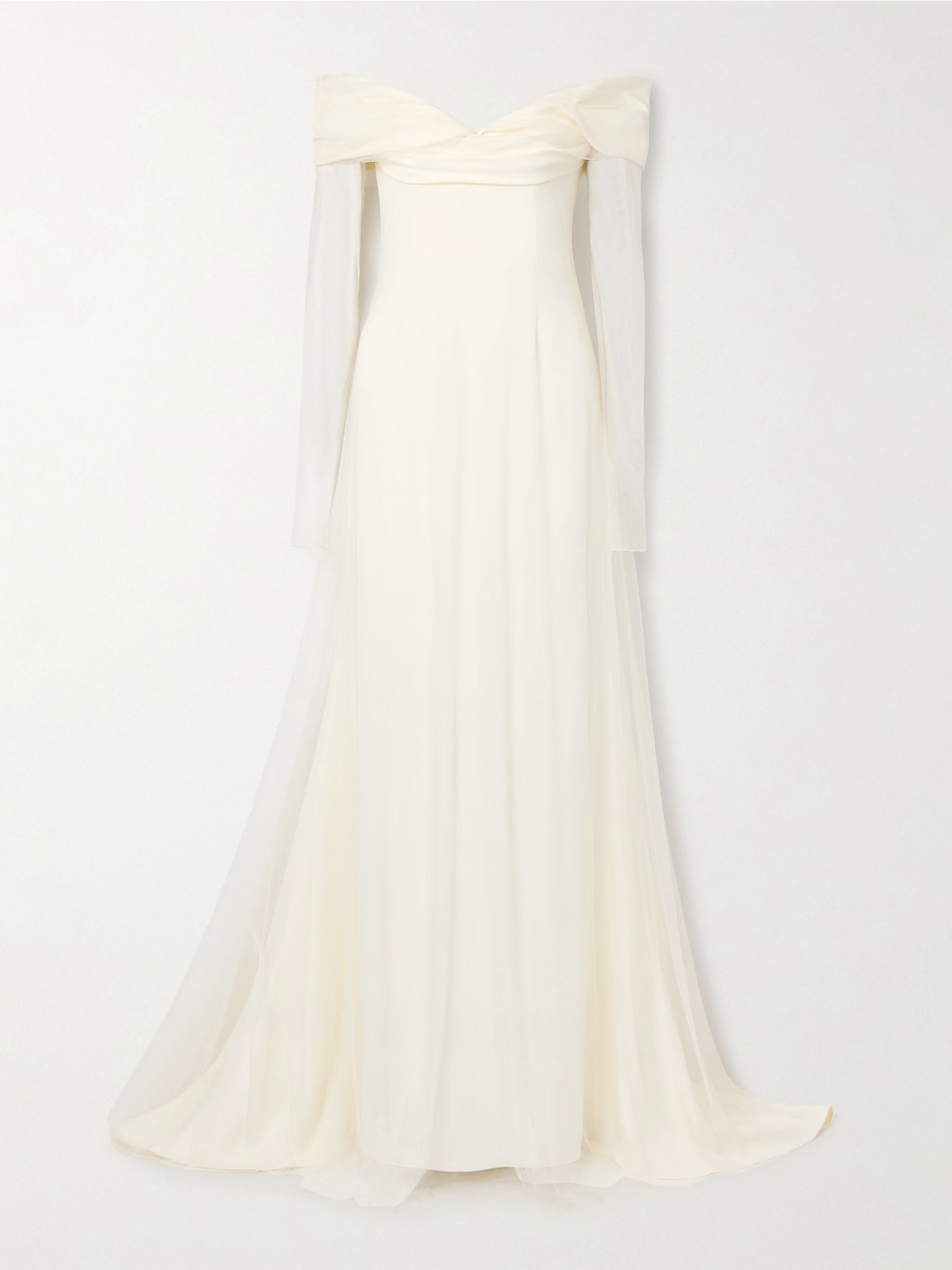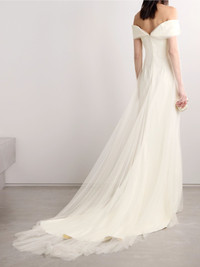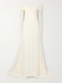 Danielle Frankel is an expert at creating bridalwear that feels both contemporary and classic. This off-the-shoulder 'Eloise' gown is made from cady and has an ethereal tulle overlay, keeping the sleeves sheer and adding drama to the train. The slim-fitting bodice is supported by internal boning. Size & Fit - Fits true to size, take your normal size - Intended to be fitted at the bust and waist, slightly loose at the hip - Internal bodice for support - Train hem - Mid-weight, slightly stretchy fabric - Model is 180cm/ 5'11" and is wearing a US 4 Model measurements: - Bust: 79cm/ 31" - Waist: 61cm/ 24" - Hip: 89cm/ 35" Details & Care - Ivory tulle and cady - Concealed hook and zip fastening at back - Fabric1: 80% acetate, 17% viscose, 3% elastane; fabric2: 100% polyester; lining: 100% polyester - Dry clean - Designer color: Pearl