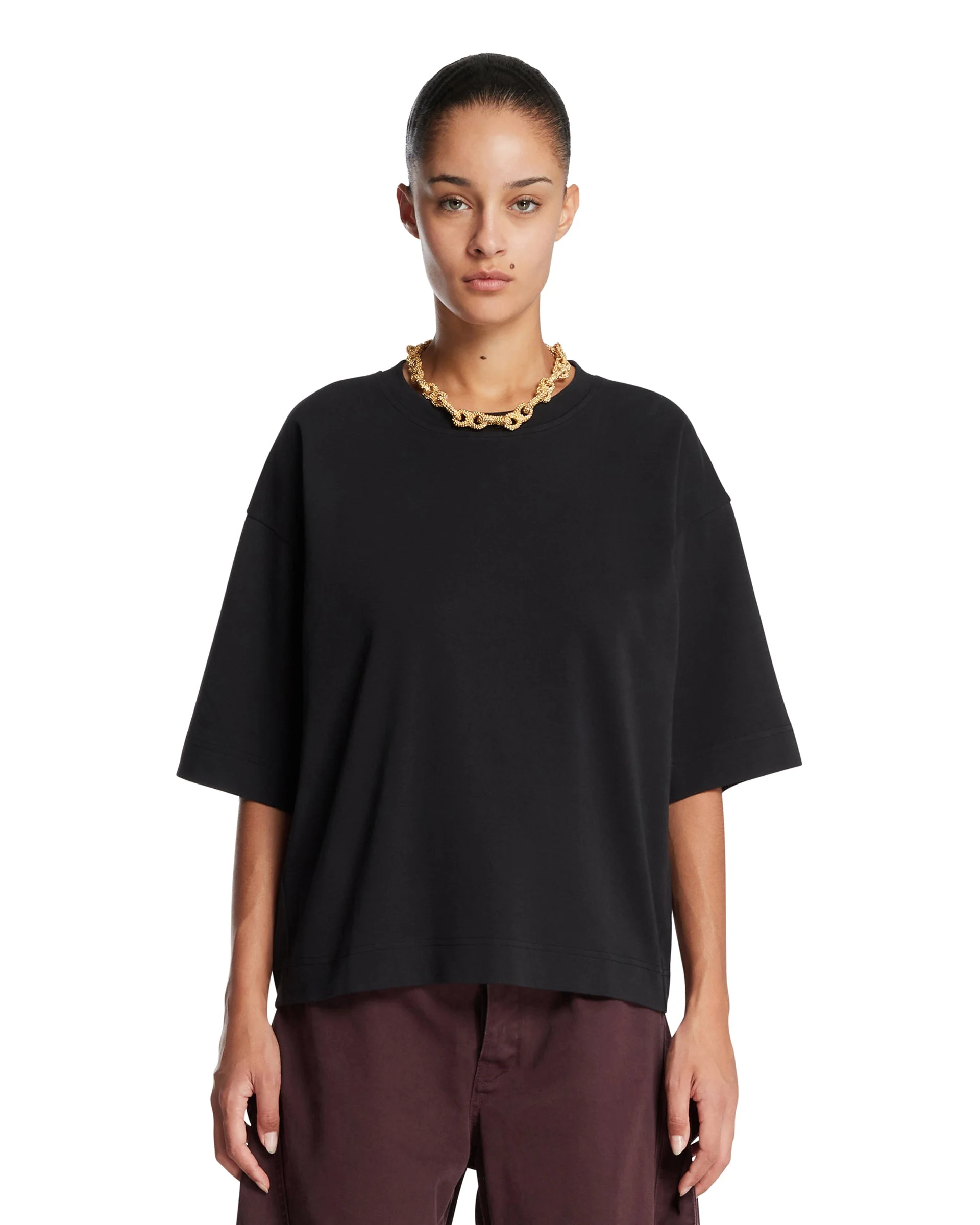 Darkpark Black Smith T-Shirt. Black cotton jersey, crew neck, short sleeves, dropped shoulders, straight hem. Alicia is 174 cm and she is wearing size S. DETAILS Model: WJE09JER010099 Composition: 100% Cotton Made in: PORTUGAL Season: FW25-26