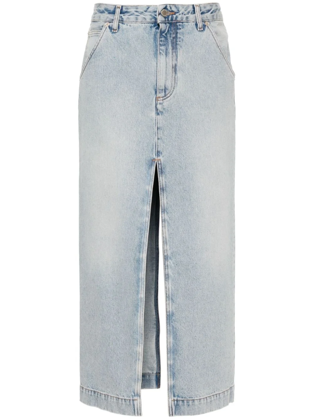 Erika denim midi skirt Highlights - Light blue - Denim - Belt loops - Classic five pockets - Front and rear slit - Logo patch to the rear - Mid-length - Pencil silhouette - Concealed fly and button fastening Made in Italy Composition Outer: Cotton 100% Lining: Polyester 65%, Cotton 35% SIZE & FIT Model measurements Height 5 ft 11 in(1.8 m) Bust/Chest 31.49 in(80 cm) Hips 35.82 in(91 cm) Waist 24.8 in(63 cm) FittingInformation This midi-length skirt is intended to be worn just below the waist The vented hem offers movement at the rear Sturdy and hard-wearing, this denim piece offers no stretch This piece fits true to size – take your usual size